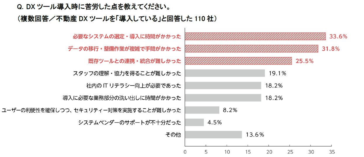 DXツール導入時に苦労したことは、「必要なシステムの選定・導入に時間がかかった」がトップでした。導入前のシステム選定に苦労する不動産会社が多いようです。
