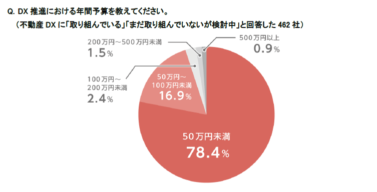 DX推進における年間予算では、「50万未満」が78.4%、「50~100万未満」が16.9%と、100万未満と回答した不動産会社が9割以上でした。