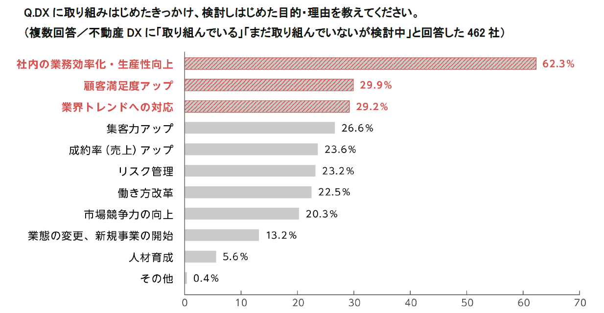 DXに取り組みはじめたきっかけを聞くと、「社内の業務効率化・生産性向上」が62.3%でした。次いで、「顧客満足度アップ」が29.9%、「業界トレンドへの対応」が29.2%と続きました。まずは、社内の業務効率化に取り組むためにDXに着手する不動産会社が多いということが分かりました。