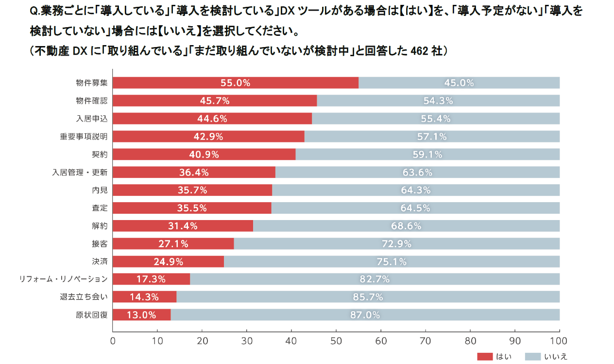 業務ごとにDXツールを導入している・導入を検討しているかどうかを聞いたところ、最もDXツールが導入されている業務は「物件募集」で、半数を超えました。そのほか、「物件確認」「入居申込」「重要事項説明」「契約」が4割以上となり、書類のやり取りが多い業務でDXツールを導入する不動産会社が多いという結果になりました。