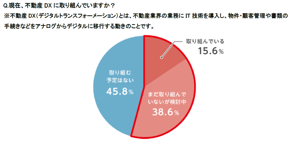 DXに取り組んでいるかどうかを聞いたところ、「取り組んでいる」15.6%、「まだ取り組んでいないが検討中」38.6%でした。半数以上の不動産会社が、DXに取り組み始めているようです。