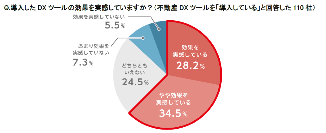 DXツールを導入している不動産会社の約6割が、「効果を実感している」「やや効果を実感している」と回答しました。一方で、「あまり効果を実感していない」「効果を実感していない」と回答したのは約1割にとどまり、DXツールの導入により効果を実感できるケースが多いようです。