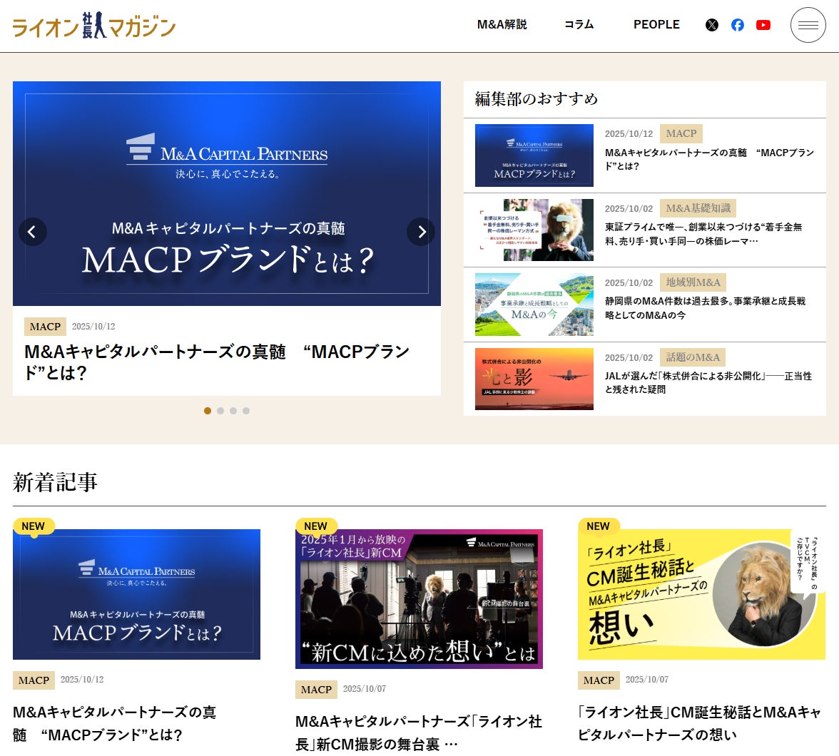 2025年10月12日に創業20年を迎えたM&Aキャピタルパートナーズ株式会社(本社:東京都中央区、代表取締役社長:中村 悟、以下「MACP」)は、2025年11月5日より、オウンドメディア「ライオン社長マガジン」を開設したことをお知らせいたします。
