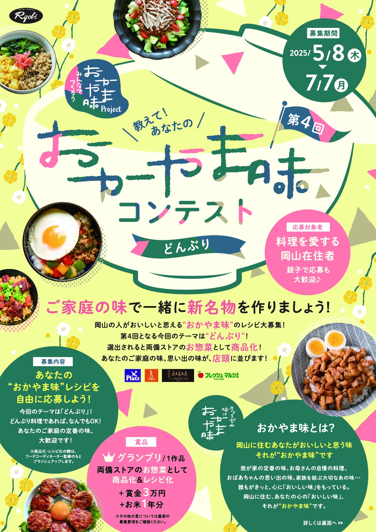 レシピの募集期間は、2025年5月8日(木)から7月7日(月)まで。ご応募いただいたレシピの中から、アイデア性、見栄え、味わいなどを審査し、2025年10月25日(土)に開催する表彰式に向けて、両備ストアの惣菜として商品化する各賞を決めてまいります。