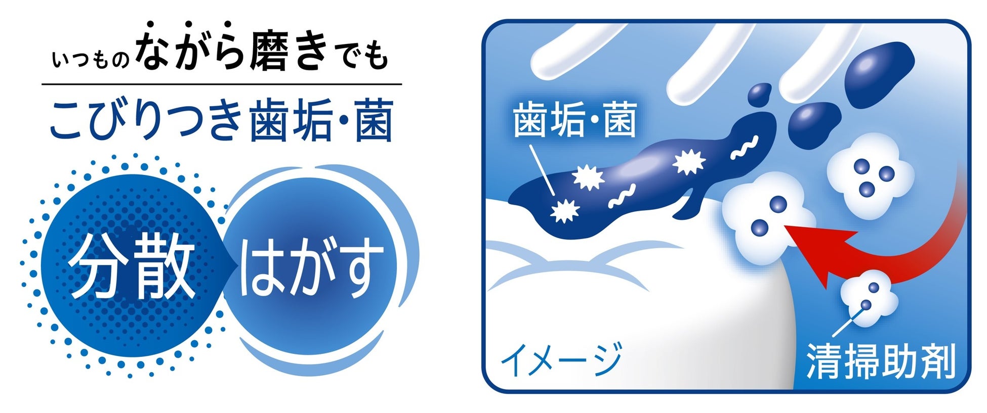 「薬用ピュオーラ ハミガキ」は、取れにくいこびりつき歯垢や菌をゆるめてはがす処方に改良。いつもの“ながら磨き”でも、歯垢や菌を根元から除去します。さらに、泡の密着性を大幅に高めることで“ながら磨き”でも垂れにくくなりました。