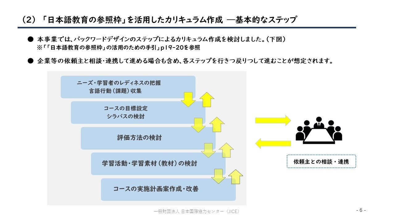 まず、「就労分野の日本語教育」の視点・特色を踏まえて、「日本語教育の参照枠」を活用したカリキュラム作成の考え方を定義し、本枠組みに沿ったカリキュラム・シラバスのサンプルを作成するとともに、具体的な作成プロセスを提示しました。
