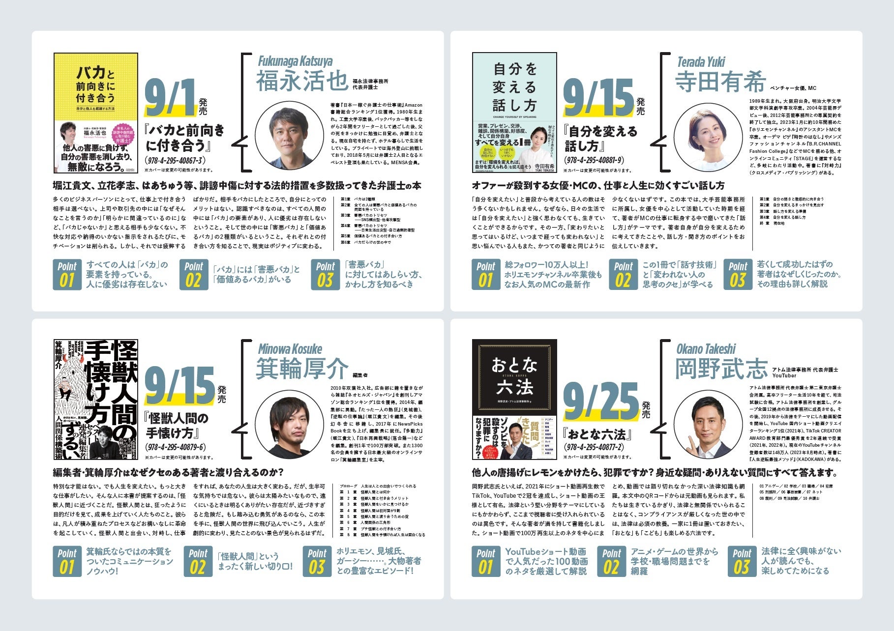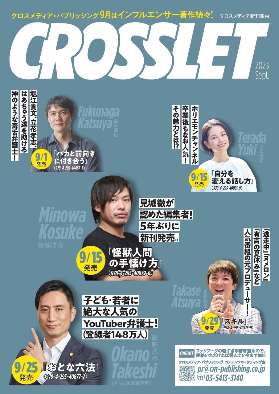 チャンネル登録150万人超のYouTuberの岡野武志の新刊や、予約段階でAmazon1位獲得の箕輪厚介5年ぶり書き下ろしなど、クロスメディア・パブリッシングの9月新刊は「インフルエンサー祭り」!