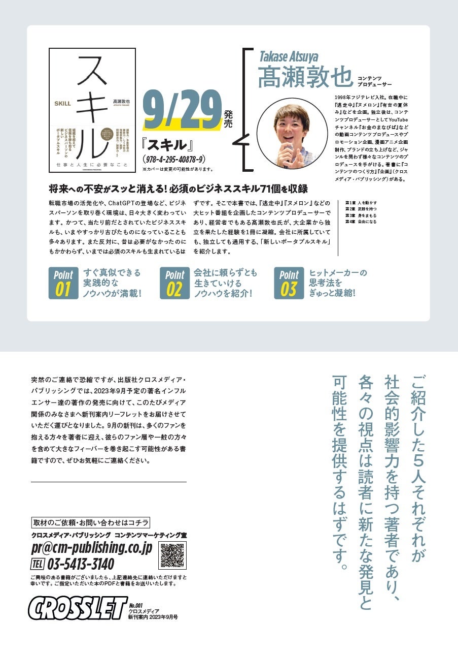 当社では、これら5冊の内容や著者の概要をまとめた小冊子「CROSSLET」を制作し、メディア関係者の方々にもお配りしています。取材依頼・お問い合わせなどもお気軽にご連絡ください。
