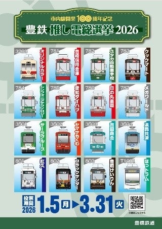 第3弾企画では、新たなデザインの記念乗車券の発売に加えて、当社では初めての開催となる、市内線車両の人気投票新企画「豊鉄“推し電”総選挙2026」を実施します。日頃より当社を応援してくださる皆さま、そして鉄道ファンの皆さまの「推し電」への熱い1票を心よりお待ちしております。