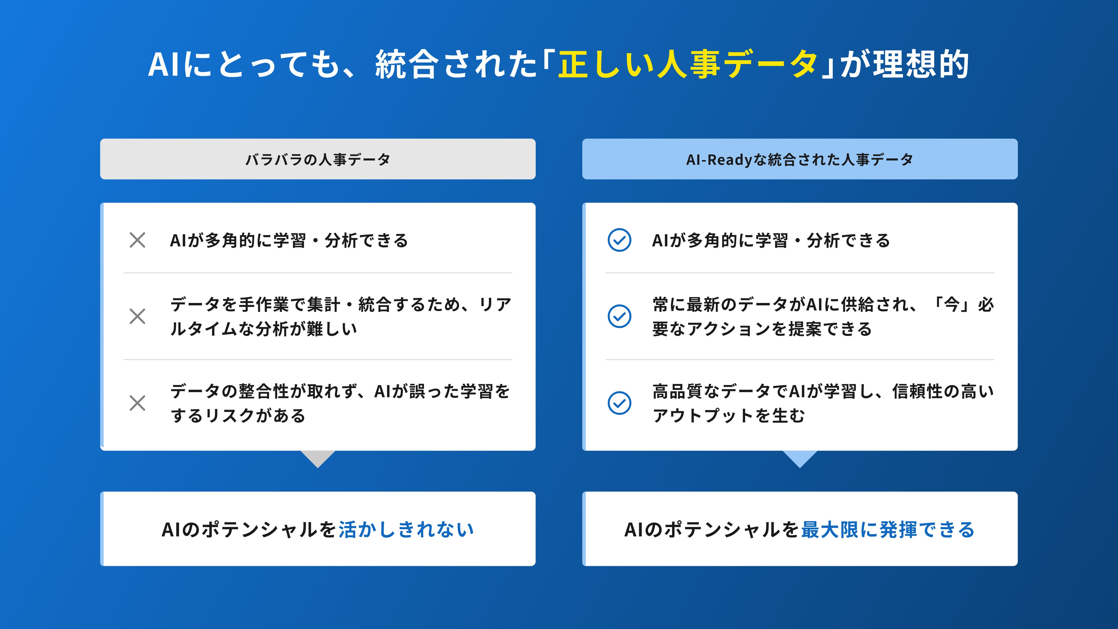 統合型人事システムだからこそ実現できる、「正しい人事データ」とAIエージェントの掛け合わせによって、人の可能性を最大解放できる世界を目指しています。