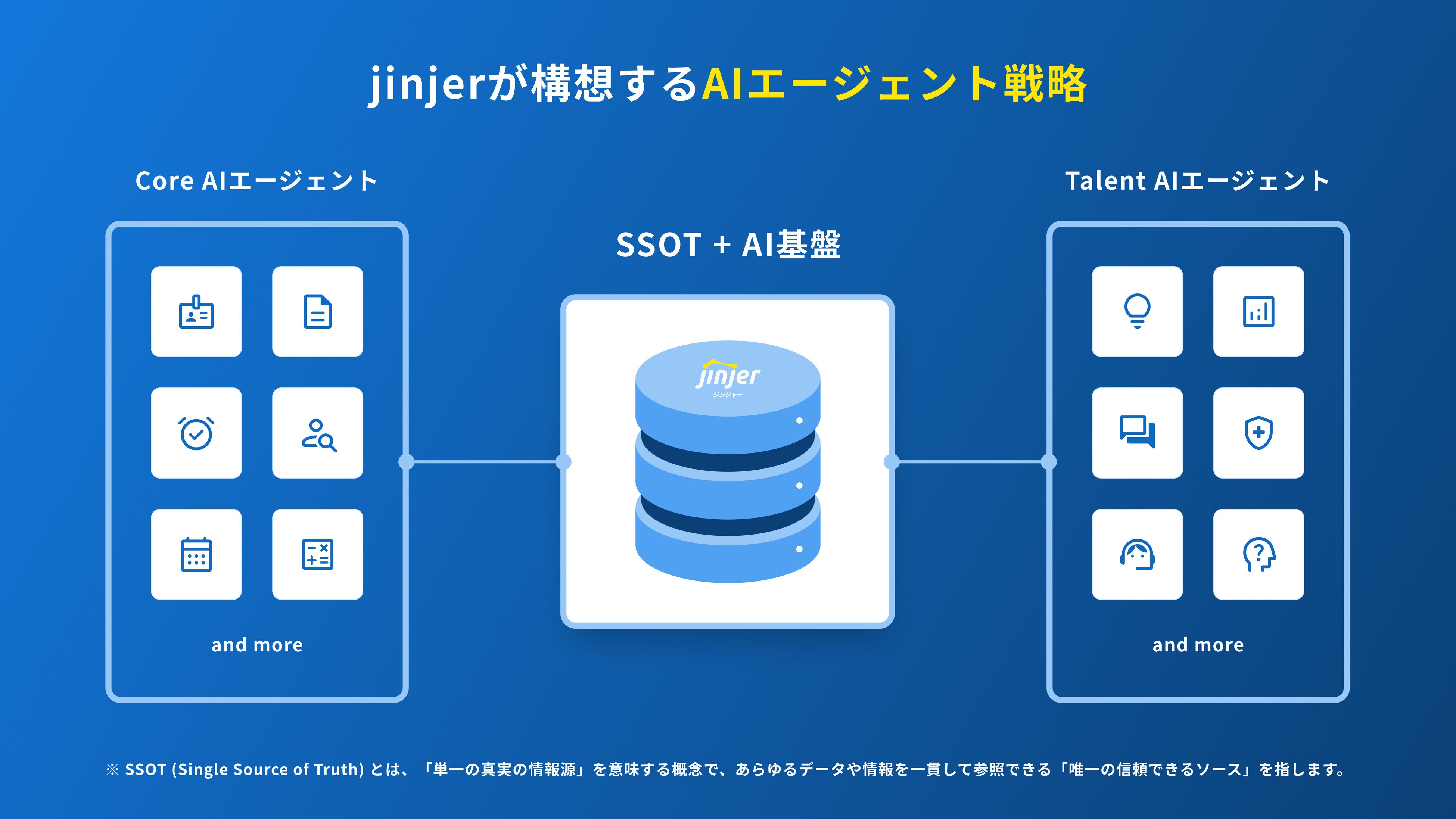 こうした背景を踏まえ、jinjerは、人の可能性を最大解放するための「AIエージェント戦略」を新たに発表しました。今回の発表は、「ジンジャー」が単なる業務効率化に留まらず、人事担当者が本来向き合うべき戦略的な業務に集中できる環境を創出することを目指すもので、下記に記載のAIエージェントの機能群を今後順次提供していく予定です。