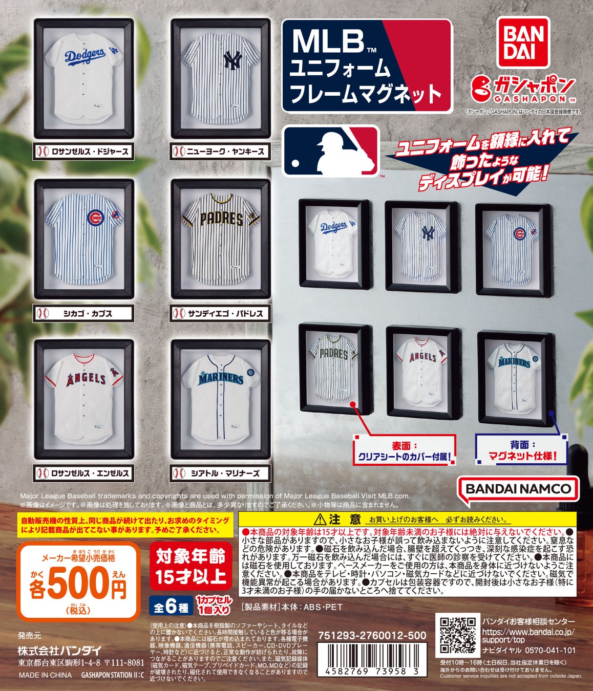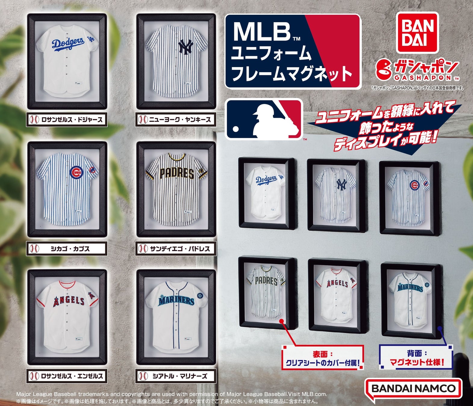 株式会社バンダイ ベンダー事業部(本社:東京都台東区)は、「MLB™」の人気6球団のユニフォームをミニチュアにした『MLB™ ユニフォームフレームマグネット』(1回500円・税10%込、全6種)を 2025年3月第3週より全国のガシャポンバンダイオフィシャルショップ、玩具売場、量販店、家電店などに設置されたガシャポン自販機シリーズにて発売いたします。