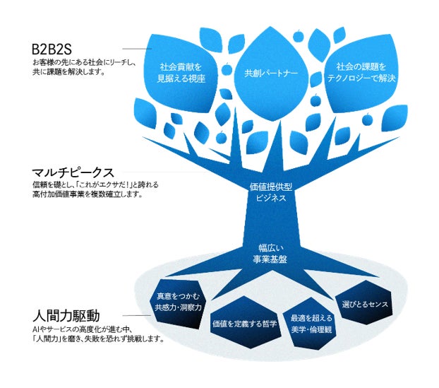 お客様の事業を通じて社会課題を共に解決する「B2B2S」企業へ。「共感」と「技術」で尖らせた高付加価値事業をいくつもの頂として確立し、AIが台頭する時代にも「あなたたちでなければ」と選ばれ続ける人間力を駆動に、挑戦し続ける集団を目指します。