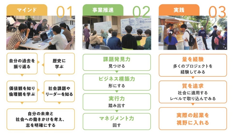 武蔵野大学アントレプレナーシップ学部では、アントレプレナーシップを「高い志と倫理観に基づき、失敗を恐れずに踏み出し、新たな価値を見出し、創造していくマインド」と定義し、主に3つの特徴的な取り組みを実施しています。