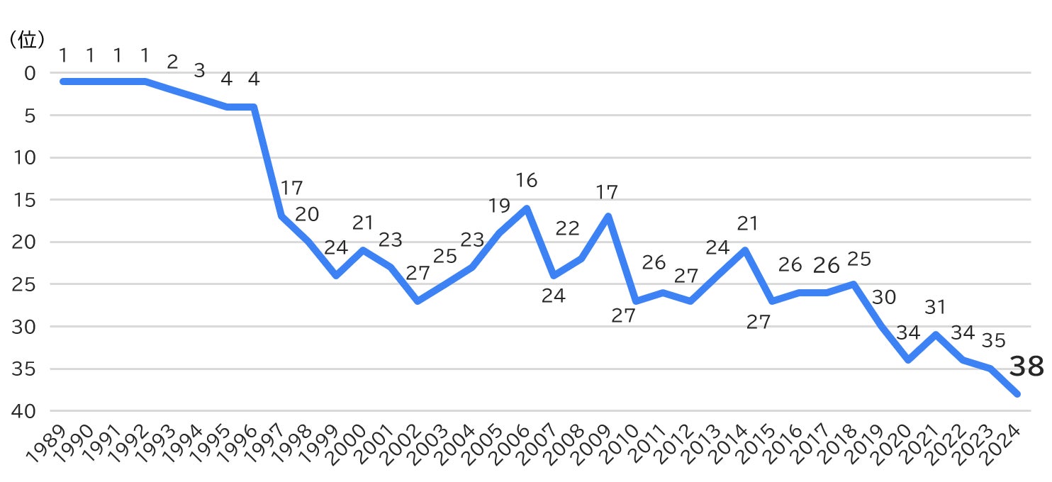 昨今、日本は「世界競争力ランキング」(国際経営開発研究所(IMD)が発表)において1992年までは1位だったにも関わらず、徐々にランクが下がっていき、2024年版では38位と過去最低を記録しています。またその中でも「起業家精神」の項目が参加国の中で最下位となりました。