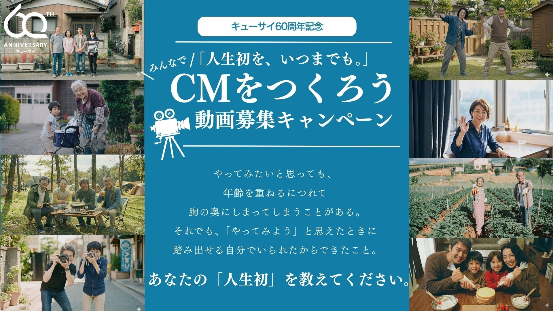 キューサイ株式会社(本社:福岡市中央区、代表取締役社長:石川 順朗)は、1965年の創業から2025年10月で60周年を迎えました。この節目にあたり、「“あなた”の人生初」をコンセプトにした様々な企画を2026年9月まで展開してまいります。第1弾は従来のCM制作とは異なる新しい試みとして、年齢を重ねた今だからこそチャレンジできた「人生初」や、これからチャレンジしてみたい「人生初」をテーマにした動画を募集し、応募作品の一部を当社のCMに使用するキャンペーンを2026年2月17日(火)より開始します。この取り組みを通じて当社は、一人ひとりがいくつになっても新たな「人生初」に挑戦できる社会の実現を目指し、前向きに歳を重ねるウェルエイジングな生き方を応援してまいります。