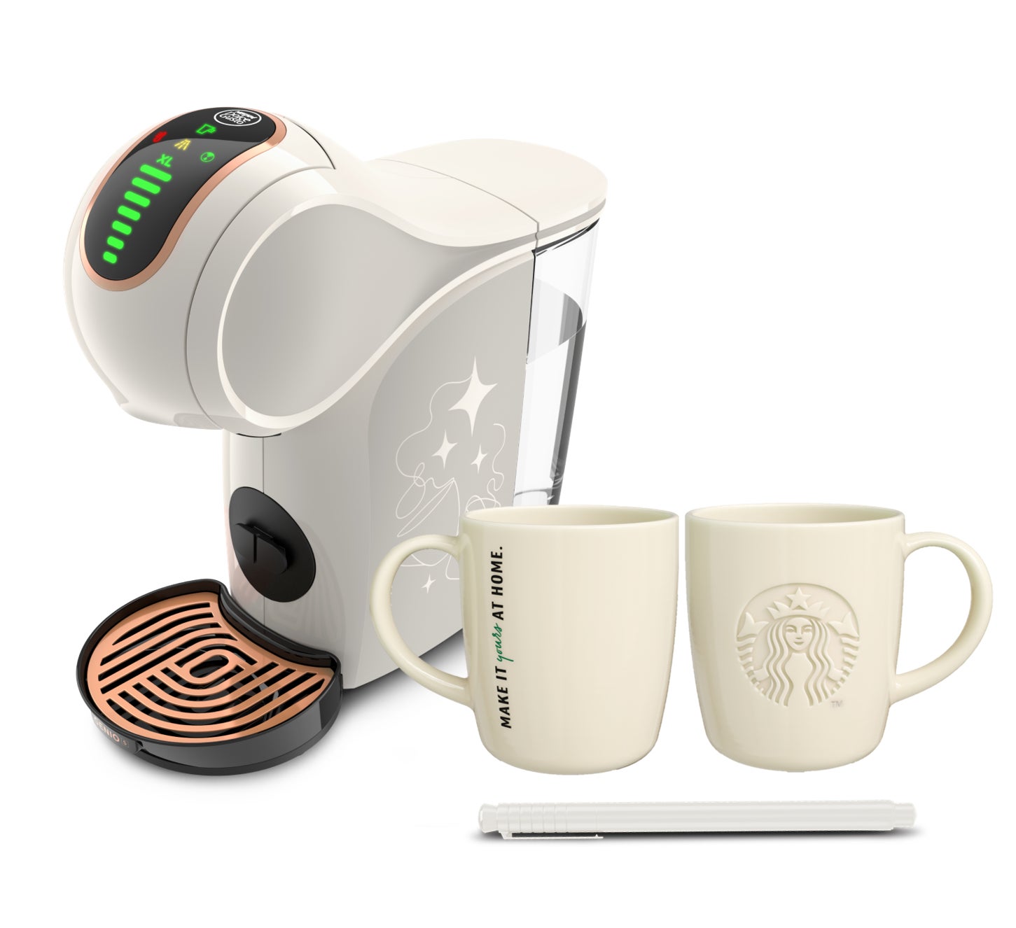「ネスカフェ ドルチェ グスト GENIO S SHARE クリームホワイト スターバックス® 体験セット」には、「クリームホワイト」のコーヒーメーカーにぴったりの「スターバックス® クリームマグ」が入っています。このマグカップには、スターバックス ブランドの象徴であるサイレンロゴが中央に大きくエンボス加工され、自宅や職場でスターバックスのカフェのような心地よい時間を思い起こさせるデザインとなっています。さらに、専用ペンで手書きのメッセージを書けば、いつもの一杯がさらに特別なものになります。