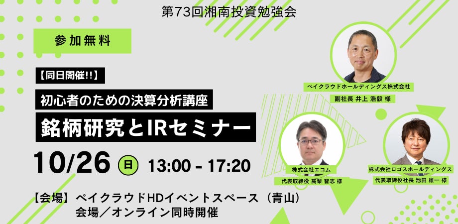 ペイクラウドホールディングス株式会社(本社:東京都港区、代表取締役社長:尾上 徹、東証グロース:4015、以下「当社」)は、2025年10月26日(日)に開催される「湘南投資勉強会」IRセミナーに当社副社長 執行役員の井上が登壇することをお知らせいたします。