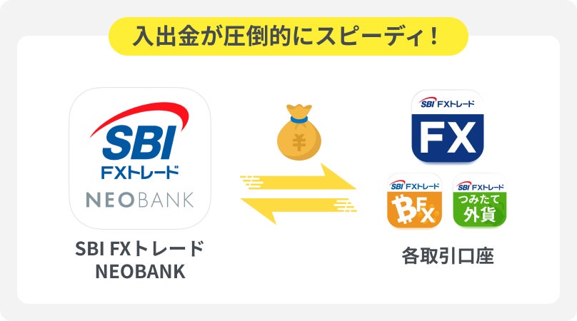 「SBI FXトレードNEOBANK」は、SBI FXトレードの口座をお持ちのお客さま向けに、住信SBIネット銀行の「NEOBANK」機能を組み込んだ銀行サービスです。FX口座と銀行口座のシームレスな連携により、スピーディーな資金移動や好金利の預金運用など、利便性の高いサービスをご提供しております。