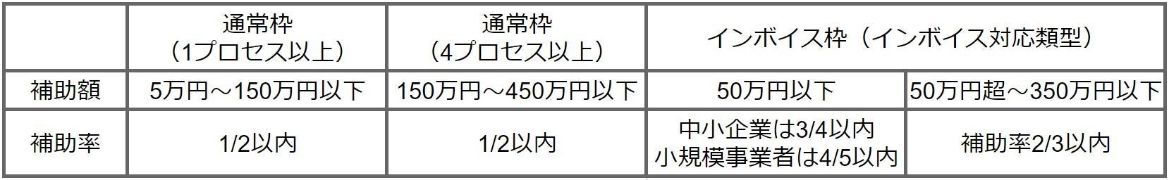 補助対象には、通常枠とインボイス枠(インボイス対応類型・電子取引類型)をはじめ5種類があり、目的に応じたITツール導入への補助金が用意されています。通常枠は、事業のデジタル化を目的としたソフトウェアやシステムの導入、インボイス枠(インボイス対応類型・電子取引類型)はインボイス制度に対応した受発注ソフト・会計ソフト・決済ソフトが対象です。