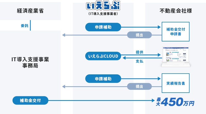 株式会社いえらぶGROUP(本社:東京都新宿区、代表:岩名泰介、以下「いえらぶGROUP」)は、経済産業省が推進する「IT導入補助金2024」においてIT導入支援事業者として採択されました。また、当社が提供する不動産に特化した業界垂直統合SaaS「いえらぶCLOUD」が補助金対象のITツールとして認定されたことをお知らせします。不動産事業者は、「通常枠」であれば補助率50%、「インボイス枠(インボイス対応類型)」であれば最大補助率80%(小規模事業者の場合)、最大450万円の補助を受けることが可能となります。
