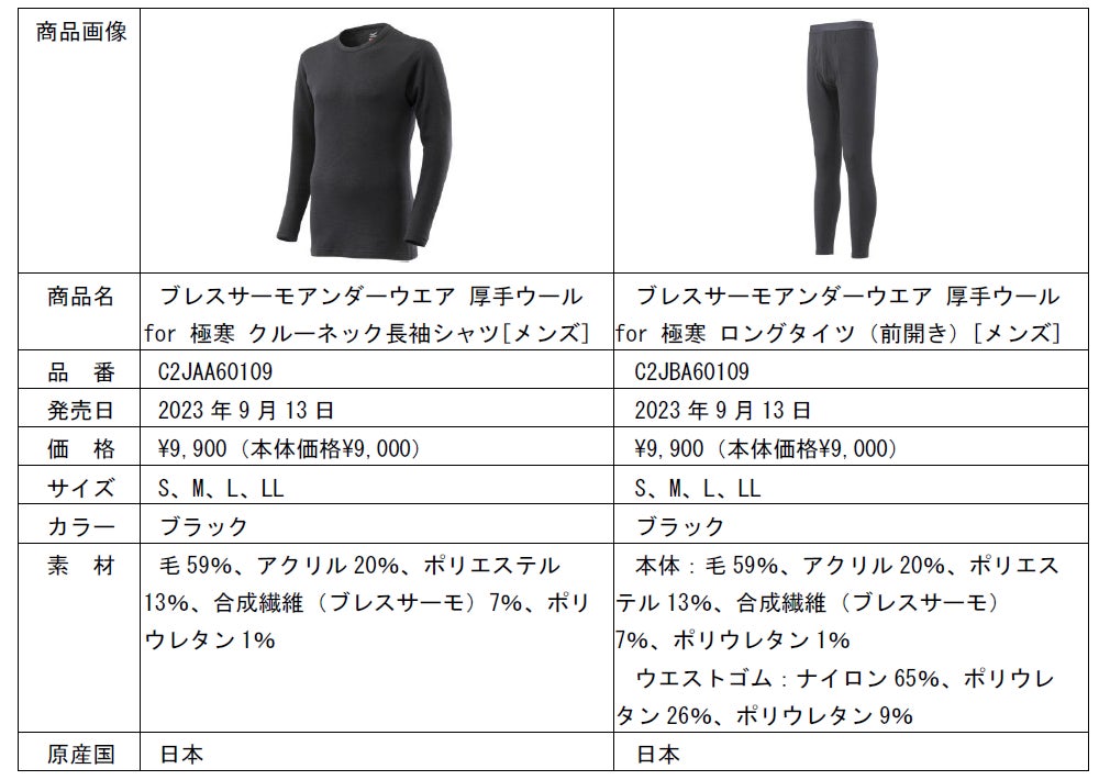 「ブレスサーモアンダーウエア 厚手ウール for 極寒」は、『ブレスサーモ』の特長である発熱力※2・保温力に加え、自然由来の天然高機能繊維メリノウールを約60%含有することで、機能性と上質でしなやかな肌触りを実現しています。高機能ウエアとしての品質の証であるウールマーク認証も取得しています。ラインナップは、男性用・女性用の長袖シャツ・ロングタイツの計4アイテムで、販売目標は2万枚(発売から1年間)です。