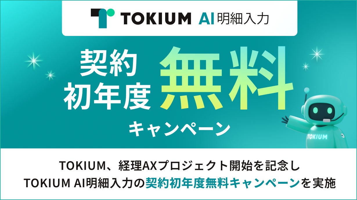 経理AIエージェントを提供する株式会社TOKIUM(本社:東京都中央区、代表取締役:黒﨑賢一、以下「TOKIUM」)は、2026年4月1日(水)より、経理AXプロジェクトの始動を記念したキャンペーンを実施します。キャンペーン期間中にTOKIUMインボイスとあわせてお申し込みいただいた新規のお客様を対象として、契約初年度に限りTOKIUM AI明細入力の利用料が無料となります。