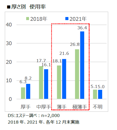 「厚さ別の使用率(エステー調べ)」を調査したところ、2018年に対し2021年には“極薄手”が26.8%から36.4%へ、“薄手”が18.1%から21.6%へと、それぞれ伸長していることがわかっています。