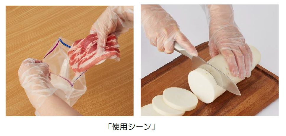 さらに、伸びる素材で手に密着する手袋の特長を活かした“小分け作業”“包丁作業”などの具体的な使用シーンの写真をパッケージ側面に採用しています。
