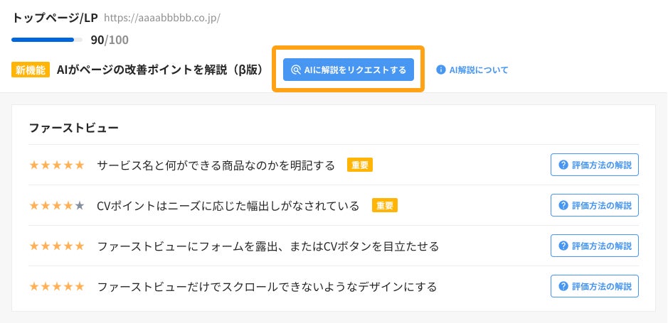 本機能では、各ページの評価結果をもとに、解説を以下の3つのセクションに分けて出力します。