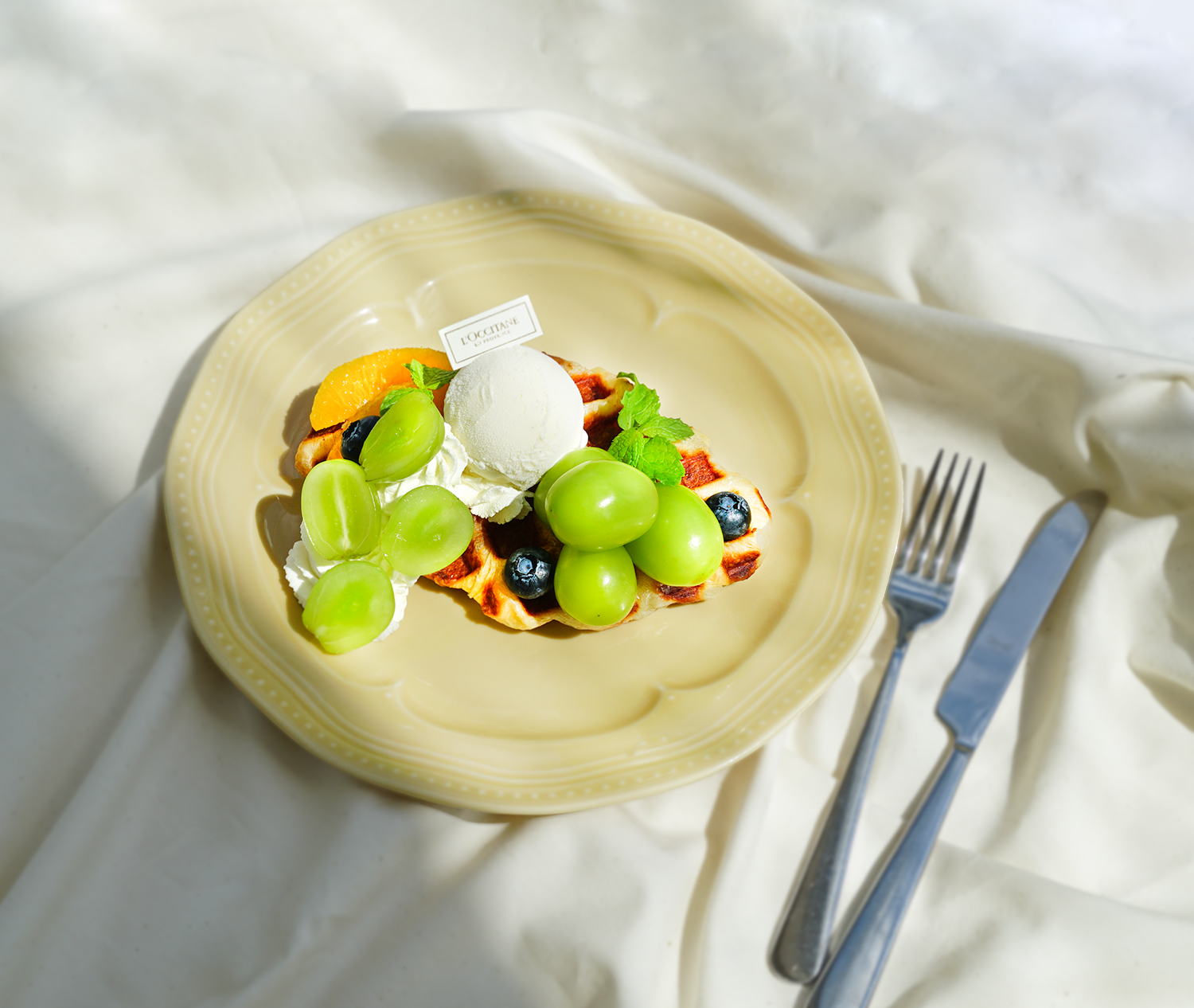 そんな「ロクシタンカフェ」秋の限定メニューは、カフェで大人気のクロワッサンワッフルに旬のシャインマスカットをふんだんに添えた「クロワッサンワッフル シャインマスカット&バニラ」。さっくり焼き上げたクロワッサンのワッフルに、秋の味覚シャインマスカットやブルーベリーを添え、上にバニラアイスクリームをのせた、フォトジェニックな一品。芳醇な甘さの秋のフルーツと香ばしいクロワッサンワッフルのハーモニーをお楽しみいただけます。