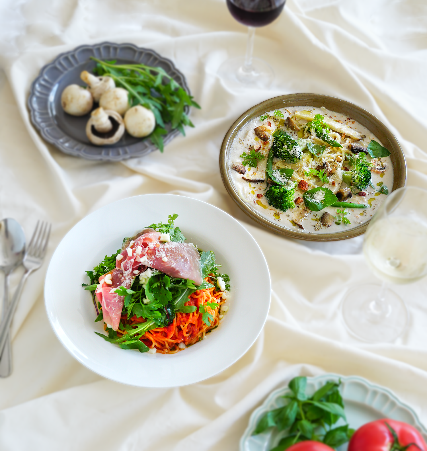 渋谷店では、秋の限定パスタが2品登場。旬のきのこを5種類(マッシュルーム・エリンギ・しめじ・椎茸・舞茸)使った「5種のマッシュルームクリームスープパスタ」は、香り高いきのこの味を楽しめるスープパスタ。きのこの歯応えと旨味がクリームソースとよく合い、一口で秋を感じられるような一品です。2品目は、フランス産プロシュートとトマトソースのパスタに、ベビーリーフやハーブ・2種のチーズをあわせた「フランス産プロシュートのトマトソースパスタ」。トマトの酸味と、塩気の効いた生ハムは、相性抜群!ランチやディナーにぜひお楽しみください。