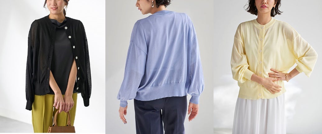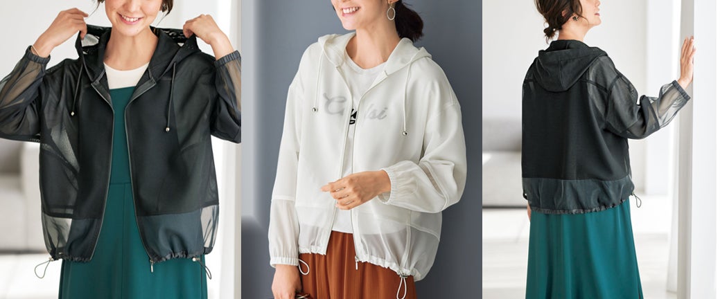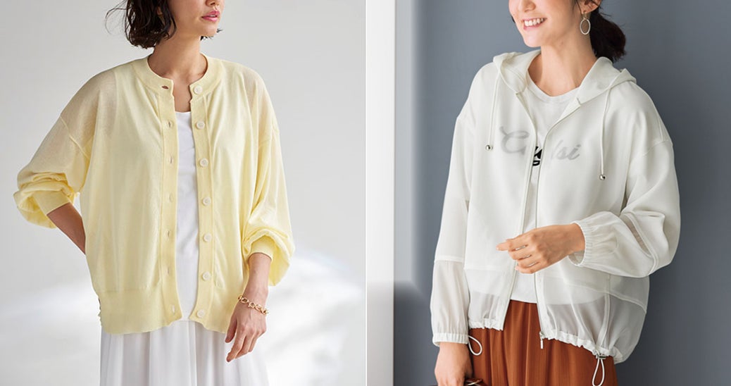 今回は、人気のシアー素材を使用したひんやり触冷感機能付きカーディガンと、透け感のあるメッシュ素材を使用したパーカーの2点をご紹介します。普段のファッションに合わせるだけで、今年のトレンドをおさえた透け感のあるスタイリングが実現します。思わぬ日焼けや肌寒さが気になる季節に、爽やかな装いで夏のおしゃれが楽しめるアイテムです。