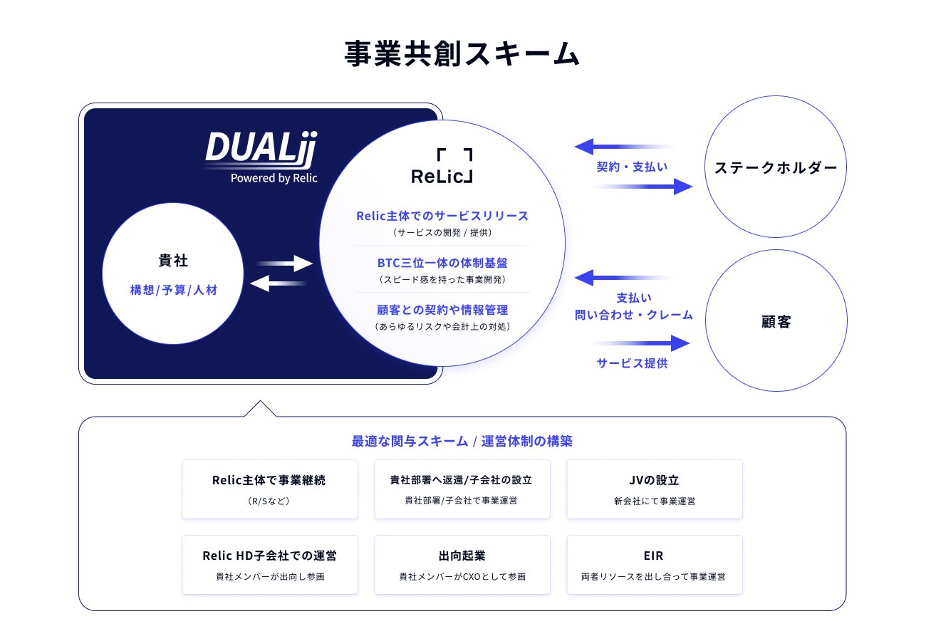 「DUALii」は、大企業の新規事業開発における推進力や検証スピードの課題を解消するために設計された、業界初(※1)の出島共創スキームです。顧客に代わりRelicが“代理検証・代理運営”の立場で、事業企画・仮説検証からプロダクト開発、マーケティングや営業、運用支援まで、事業主体としての機能を一気通貫で担います。