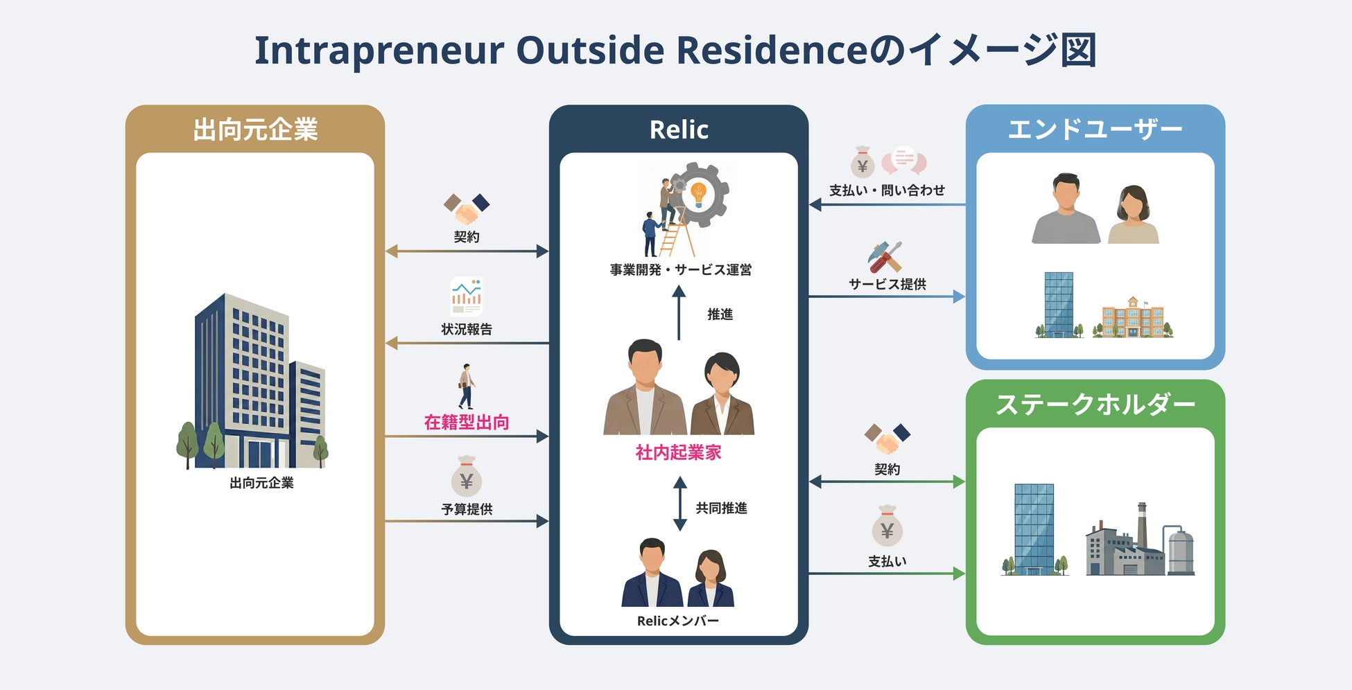 事業共創カンパニーのRelic、新規事業創出に特化した在籍型出向サービス「Intrapreneur Outside Residence」を提供開始、社内起業家が「出島」でスピーディに事業創出可能に