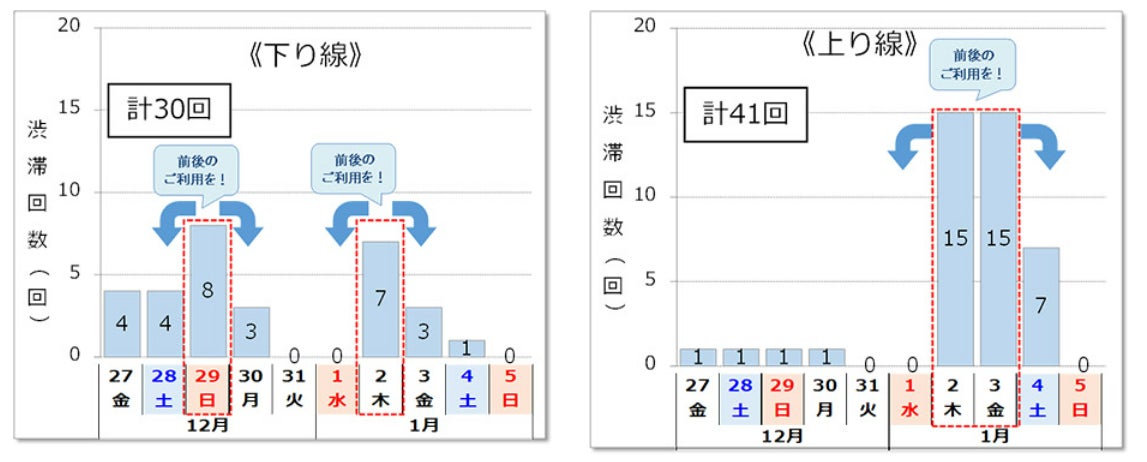 ・NEXCO西日本管内の渋滞回数は、下り線では12月29日(日曜)・1月2日(木曜)、上り線では1月