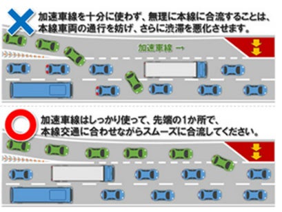 インターチェンジやジャンクション、サービスエリア・パーキングエリアなどから高速道路の本線に合流する箇所では、渋滞が発生しやすくなります。混雑時の合流部では加速車線を十分に活用し、先端の1か所で合流するファスナー合流へのご協力をお願いします。