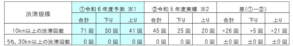 令和5年度の渋滞回数(実績)との比較は以下のとおりです。なお、令和5年度実績には、事故などの影響による渋滞が含まれています。