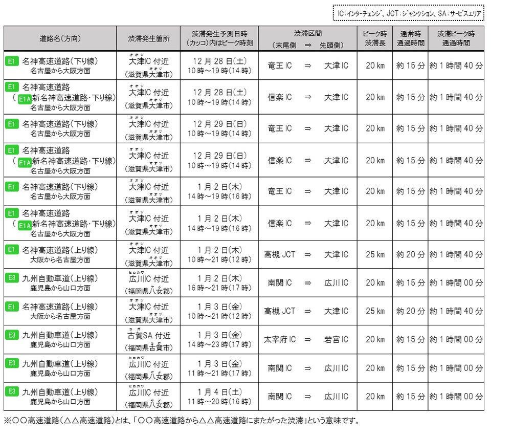 NEXCO西日本管内の年末年始期間における高速道路の渋滞予測について