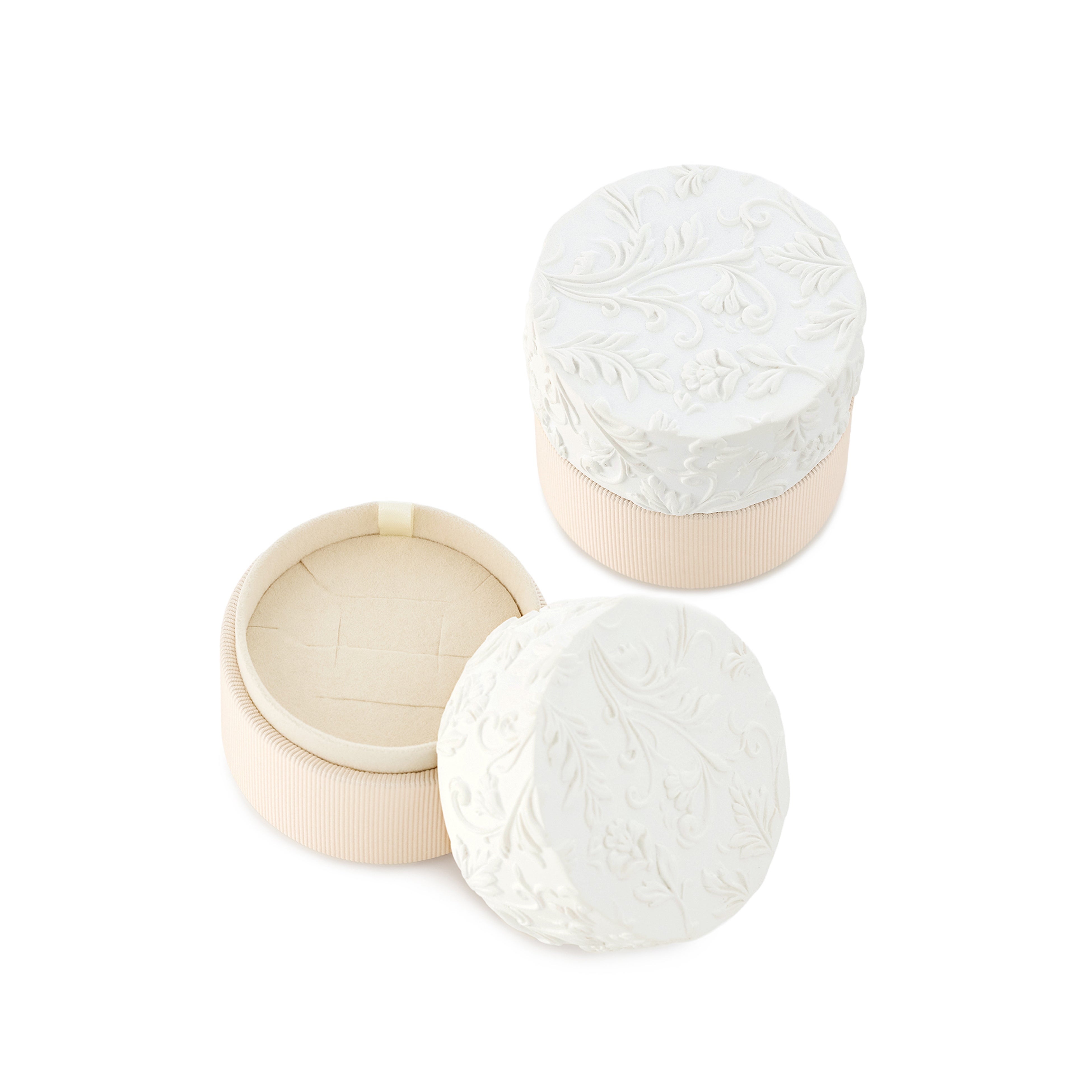 スプリングコレクションの世界観をイメージした限定パッケージ。上部には春に芽吹く花々をイメージした模様が施され、やわらかな光を受けて浮かび上がる立体的な陰影が印象的です。そっと蓋を開ける時間まで含めて、美しい。日常の中に静かな特別感を添える、洗練されたジュエリーボックスです。