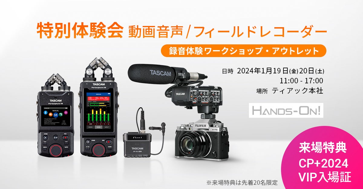 ティアック株式会社は、2024年1月19日(金)、20日(土)に東京都多摩市の本社ショールーム(多摩センター駅から徒歩約5分)にて、動画の音声機材を試せる特別体験会『TASCAM Hands-On!』を開催します。