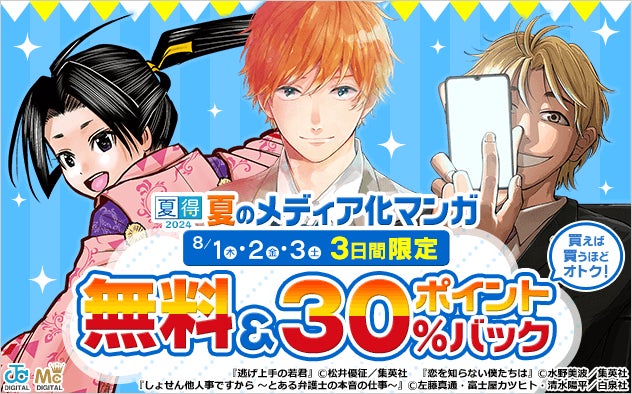 8月1日(木)~8月3日(土)に行われる第1弾では「夏のメディア化マンガ」をテーマに、『逃げ上手の若君』や『恋を知らない僕たちは』、『しょせん他人事ですから ~とある弁護士の本音の仕事~』など、今期映像化する原作マンガ30作品以上※2が対象となります。