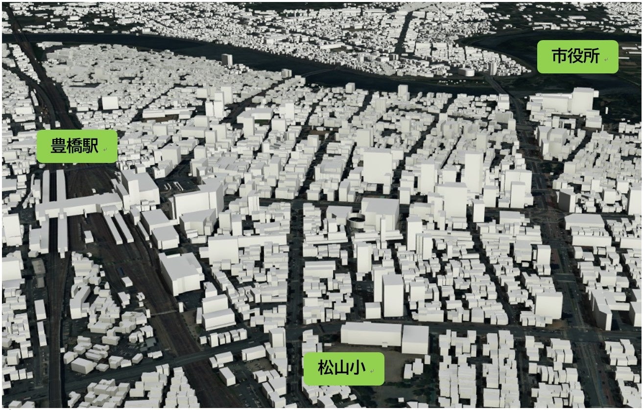 本市では市全域のLOD1(建物を箱型に再現したレベル)を整備し、262平⽅キロメートルという広⼤な豊橋市全域のすべての建物を⽴体化しました。
