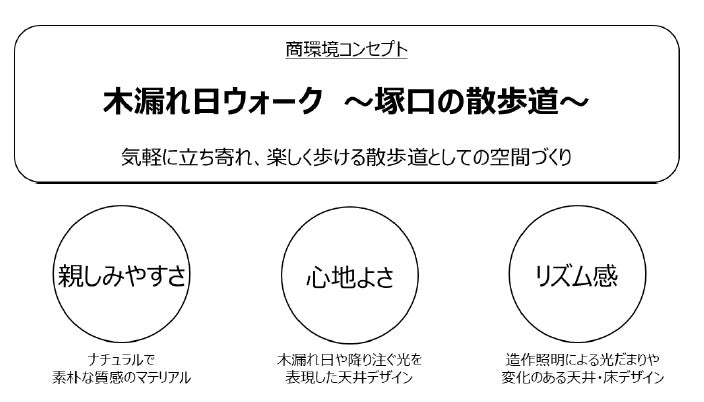 なお本施設では、大阪梅田・西宮北口・神戸三宮などの周辺都心部に近く便利な街「塚口」におけるコミュニティの起点として、街づくりへの貢献に取り組むとともに、尼崎市の推進している「居心地がよく歩きたくなる駅前空間創出事業」とも連携し、塚口駅前広場の公共空間利活用による賑わい創出を図ってまいります。
