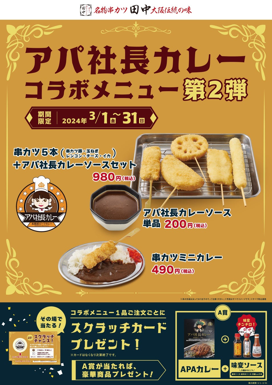 昨年大好評のコラボが再び実現!!3月1日(金)より期間限定で「アパ社長カレー」コラボメニューを全国の串カツ田中で販売