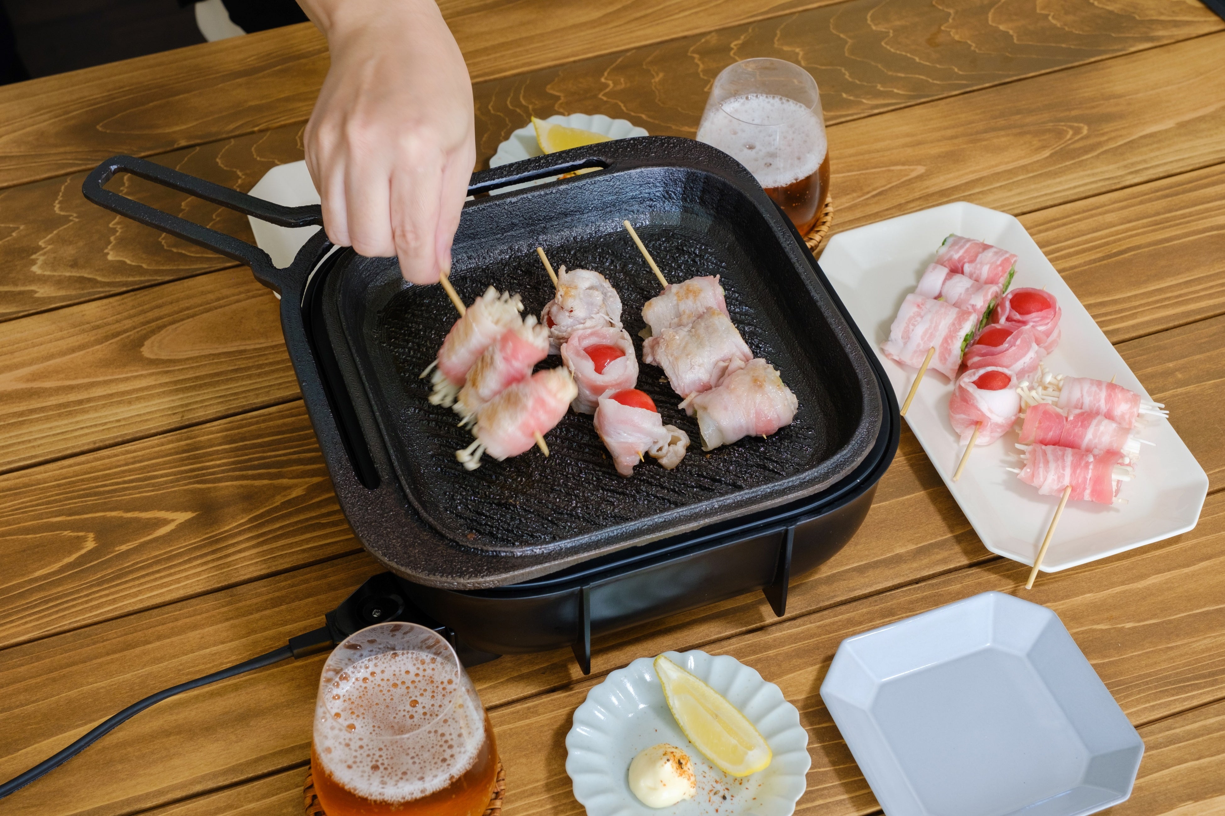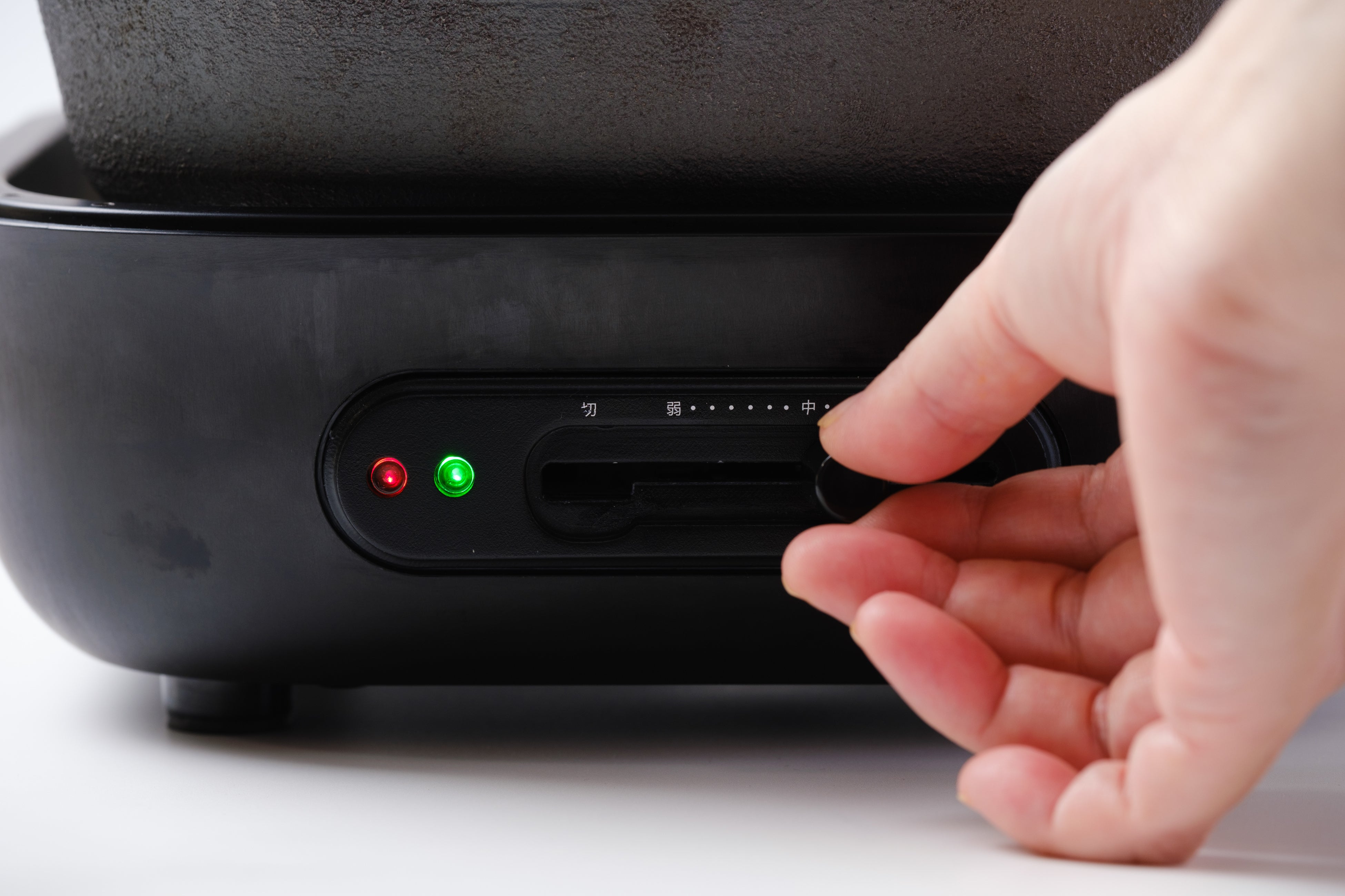 電気卓上コンロはおよそ縦25cm×横25cm×高さ9cm、1~3人のご家庭で気軽に使えるサイズ感です。食卓を邪魔せず、出しっぱなしでも問題ないサイズです。