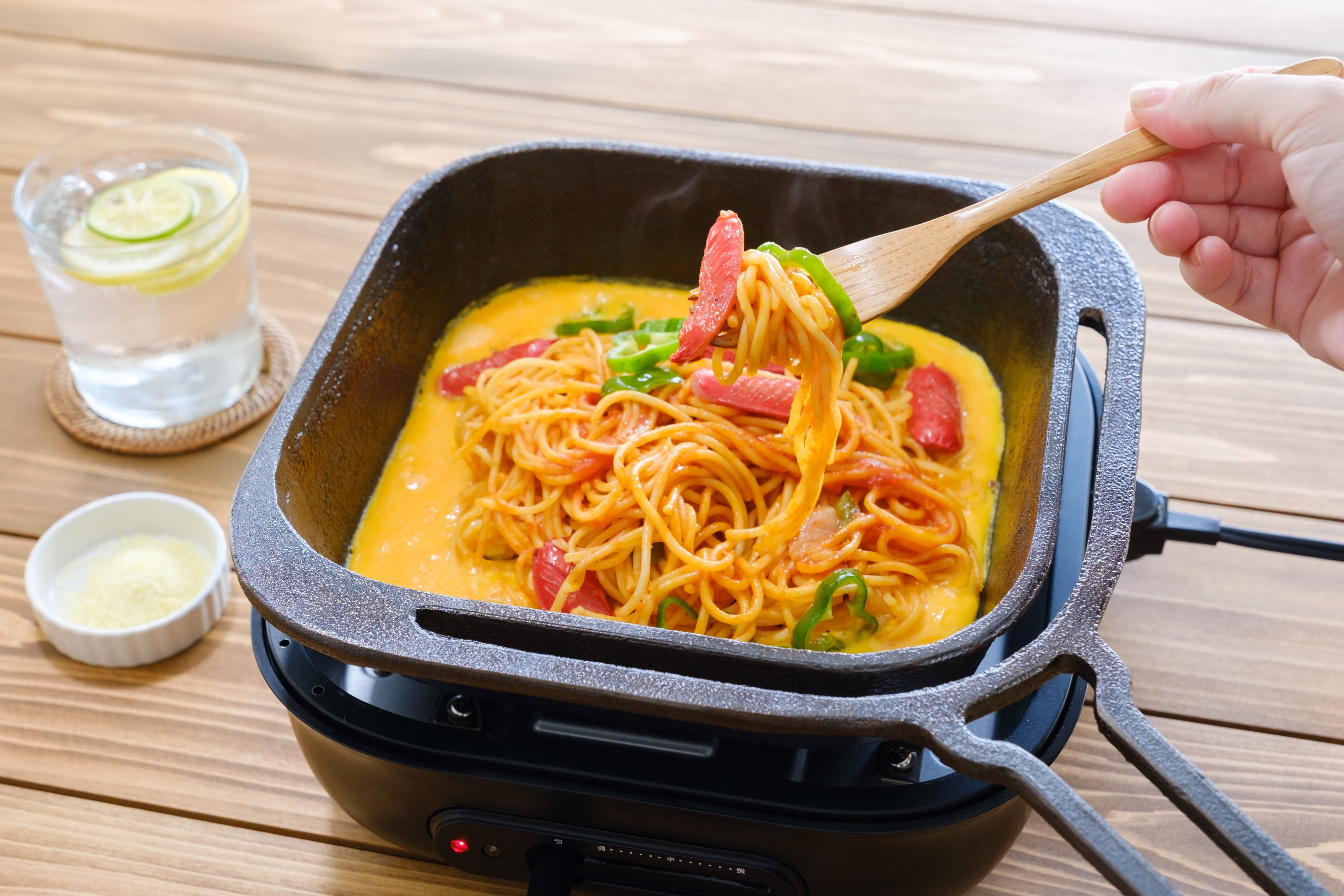 昼 ▶場所を取らないサイズで1人分のご飯にもちょうどいい。自宅でパパッと鉄板スパゲティ。