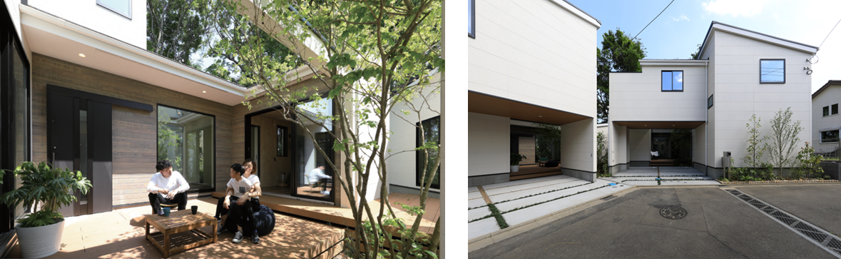 外部からの視線や動線を制限することで安⼼できる庭となり、⼦ どもたちは活動的になる。家の中⼼から⼦ どもの笑い声や⾜⾳が家族に響き、楽しく育児ができる空間を⽬指した。