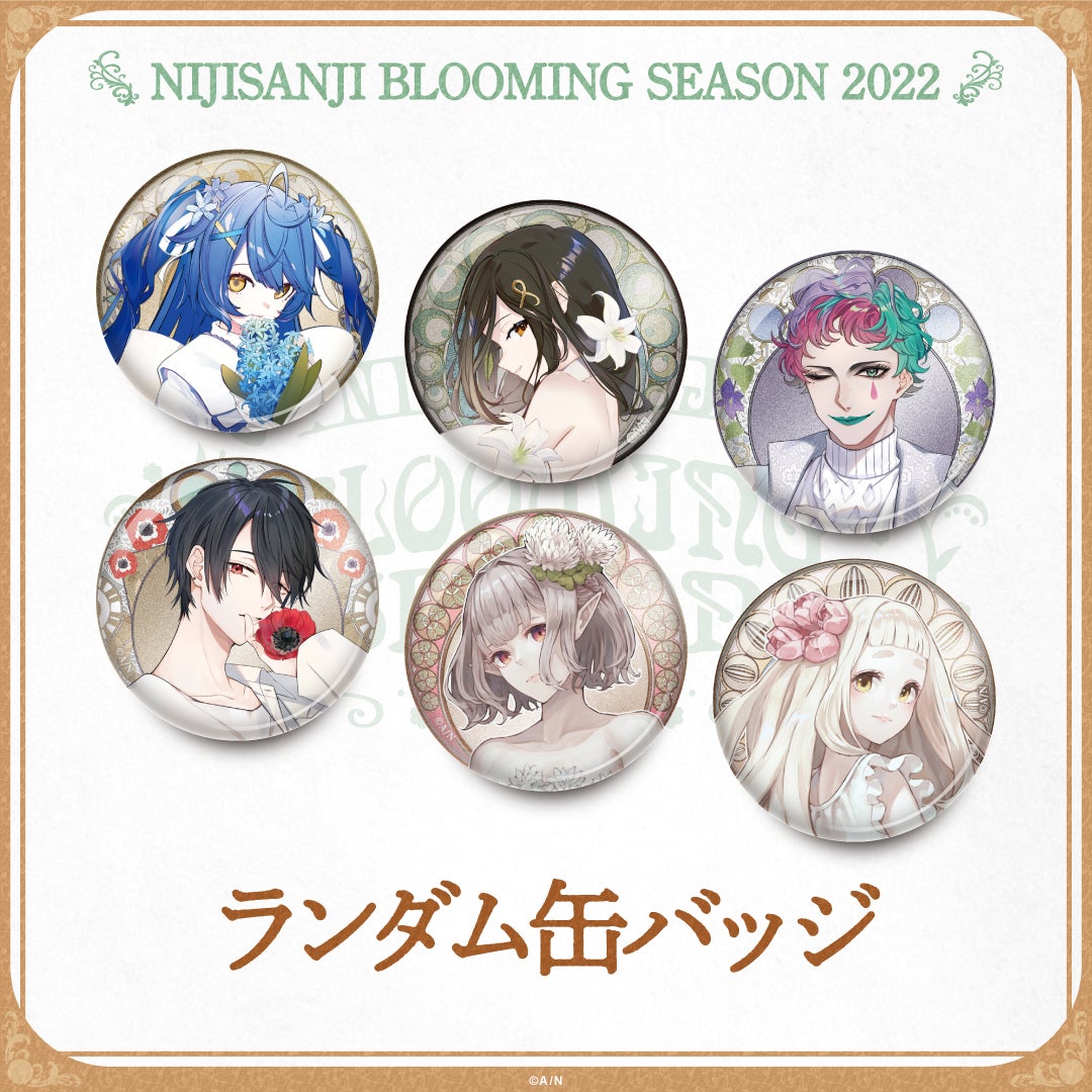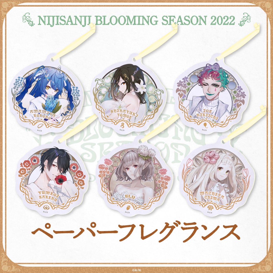 白を基調としたきらびやかな装飾の「にじさんじブルーミングシーズン」グッズラインナップは、ラメ仕様のランダム缶バッジ、豪華な箔押し仕様のアクリルスタンドとポストカードセット、ライバーをイメージした香りが楽しめるアロマキャンドルやペーパーフレグランスの計5種類。