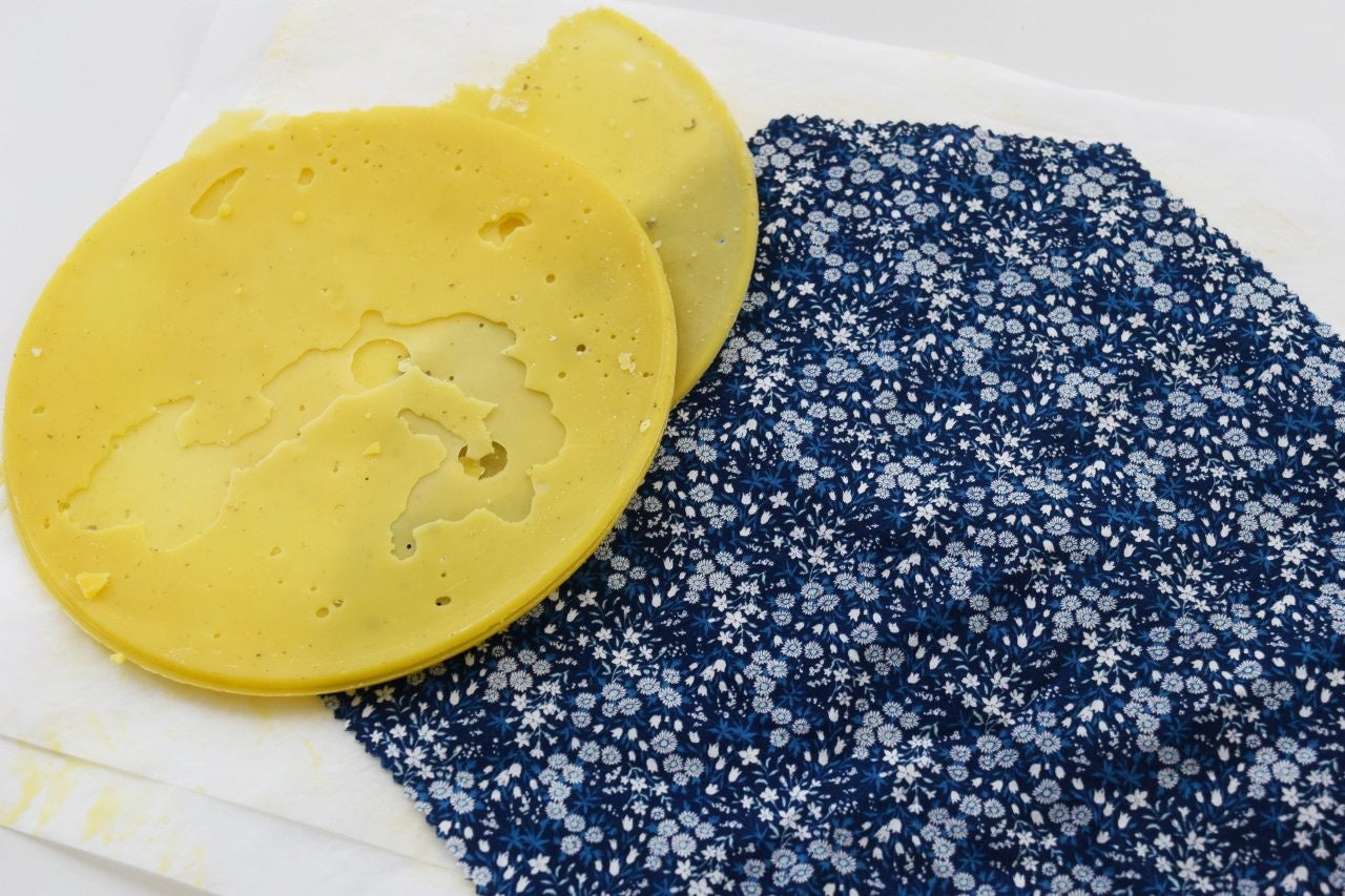 洋品店から廃棄される”はぎれ”に、みつばちが巣をつくる材料である”みつろう”を染み込ませて、繰り返し使えるエコなみつろうラップ(食品用ラップの代用品)を作ります。